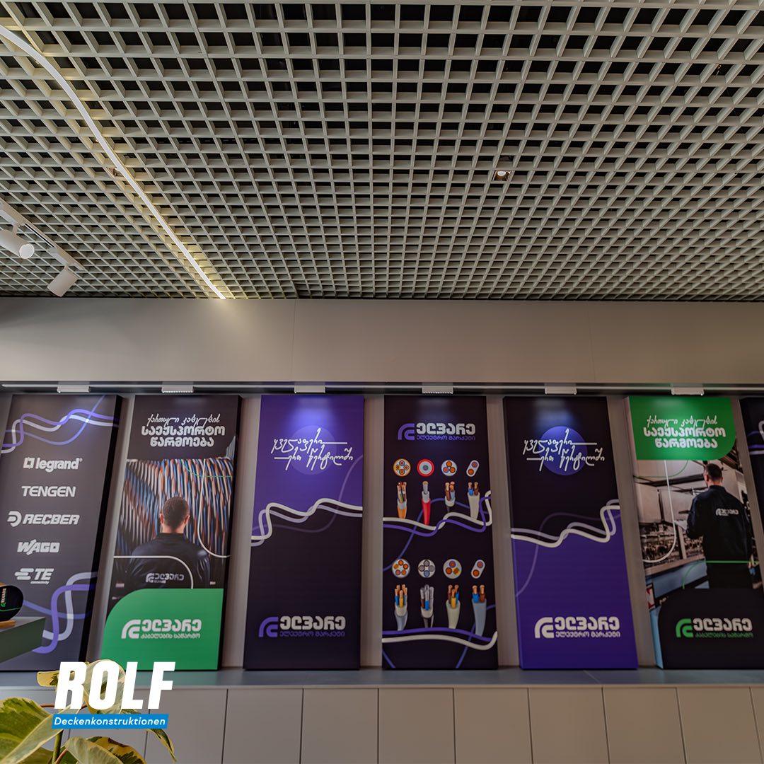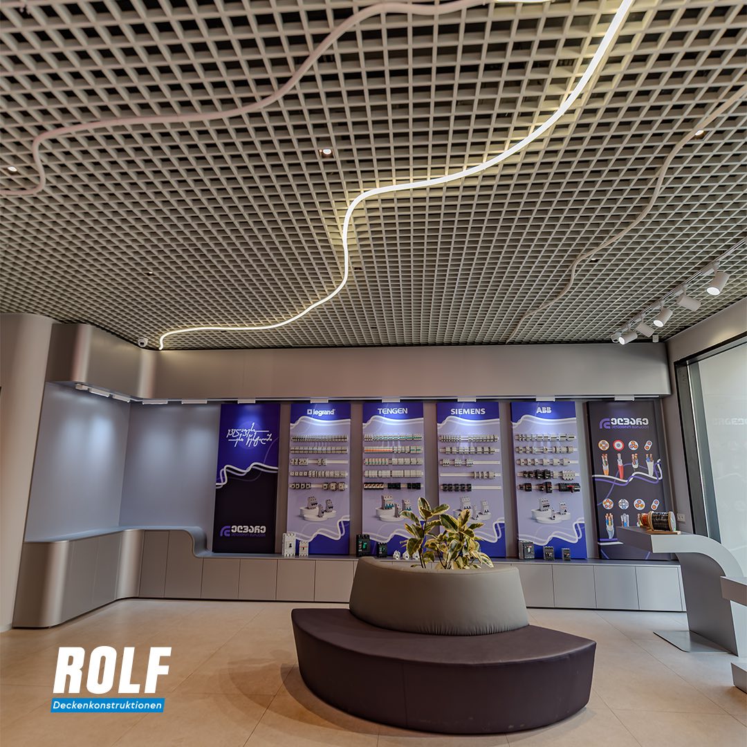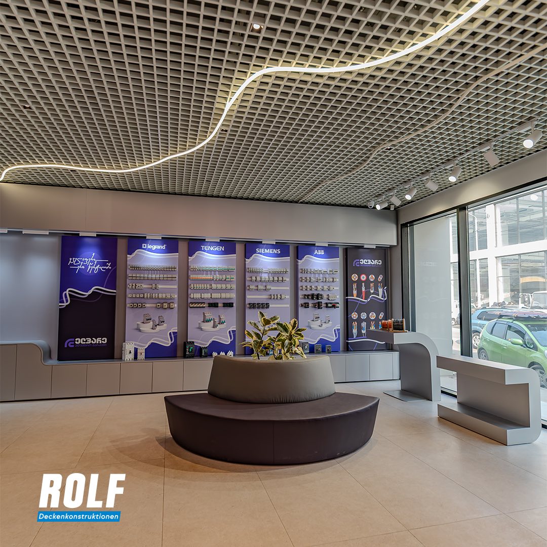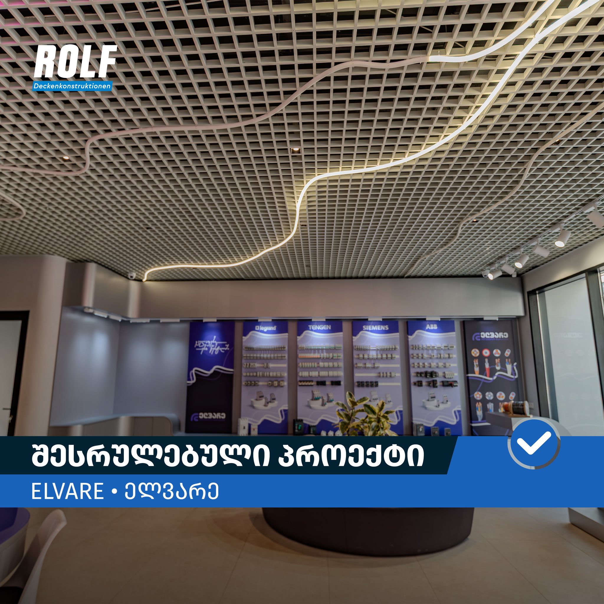 Современный и инновационный шоурум, сочетающий в себе технологическое развитие, эстетику и функциональную планировку пространства. Шоурум «Эльваре» оборудован потолочной системой ROLF cellular grilliato, идеально подходящей для промышленных и выставочных помещений.