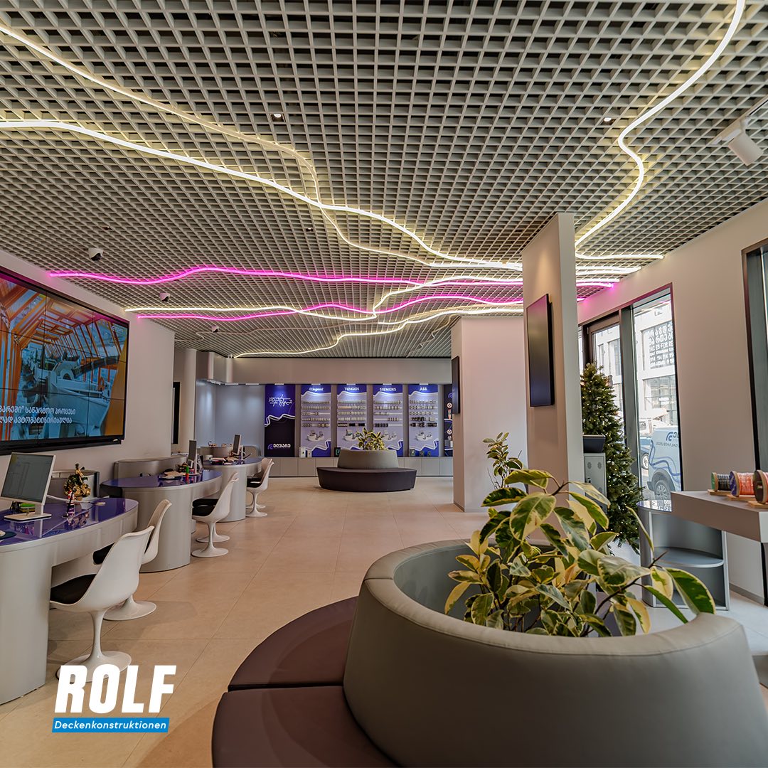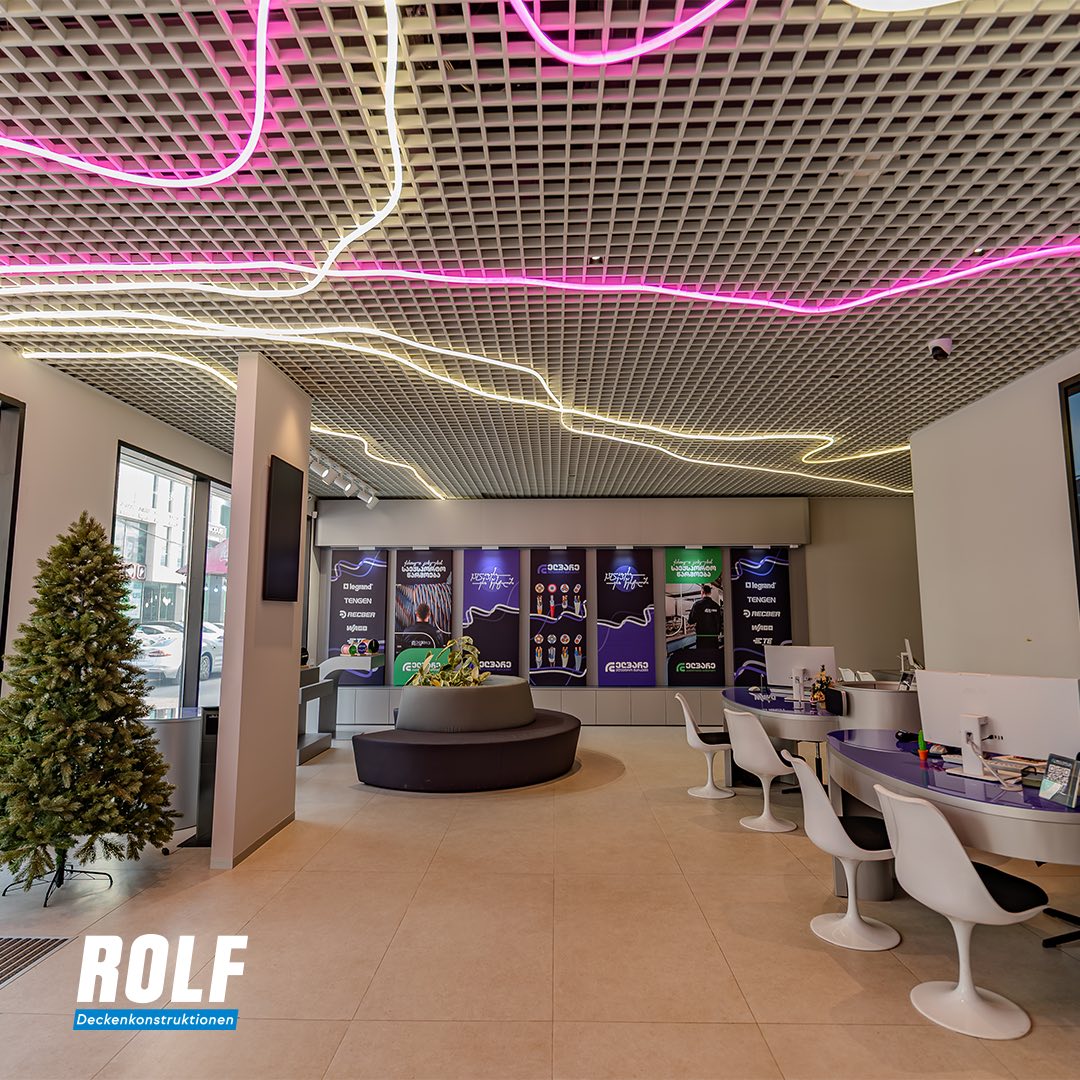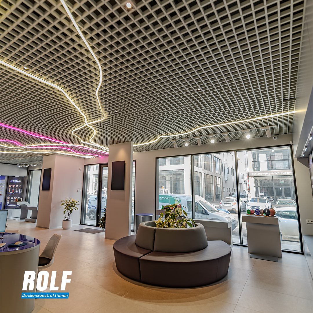 Сотовая система grilliato обеспечивает эффективное распределение света и снижает визуальную нагрузку, что делает пространство шоурума более комфортным и ориентированным на продукт.
