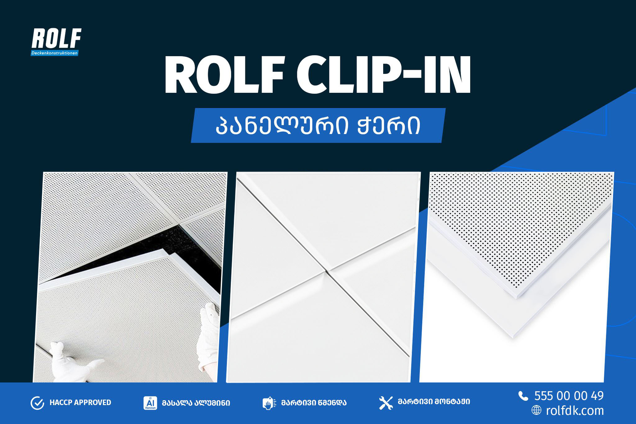 ROLF-ის ქლიფინ ტიპის პანელური ჭერები არის სრულად დახურული ტიპის შეკიდული ჭერი, რომელიც იწყობა ფარული მზიდი პროფილის კონსტრუქციით, 60×60სმ სტანდარტის სისტემით. უზრუნველყოფს მარტივად წმენდად, ერთიან, ერთგვარონ ვიზუალს და ამავდროულად მაქსიმალურად ინარჩუნებს შეკიდული ჭერის ფუნქციურ მახასიათებლებს შიდა სივრცის მარტივი წვდომისათვის.